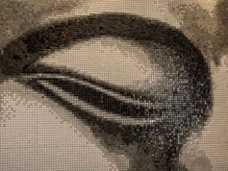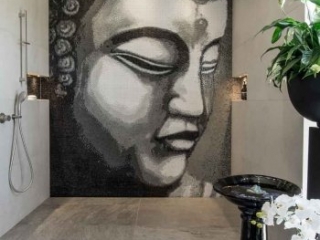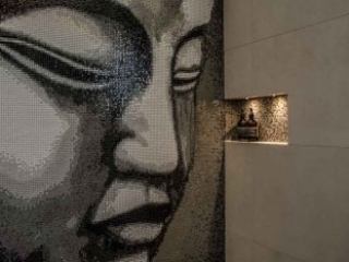 Tiles – Large format tiles: Floor Gres Walks slate grey, Gigacer Concrete graphite, Cotto d’este Limestone clay blazed, Floor Gres Industrial ivory, Pixel glass mosaics digitally created Buddha image.