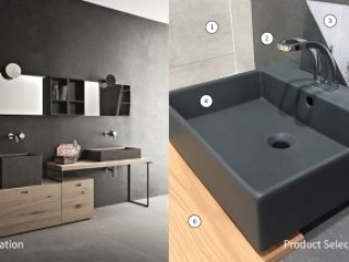 Shades of grey is the theme for this display, with contrasting slate and soft grey base tiles providing the backdrop for this look. Natural raw oak cabinetry and fun geometric shapes within the decorative tiles create an element of interest and connects with the modern rectangular basin in the colour basalto.